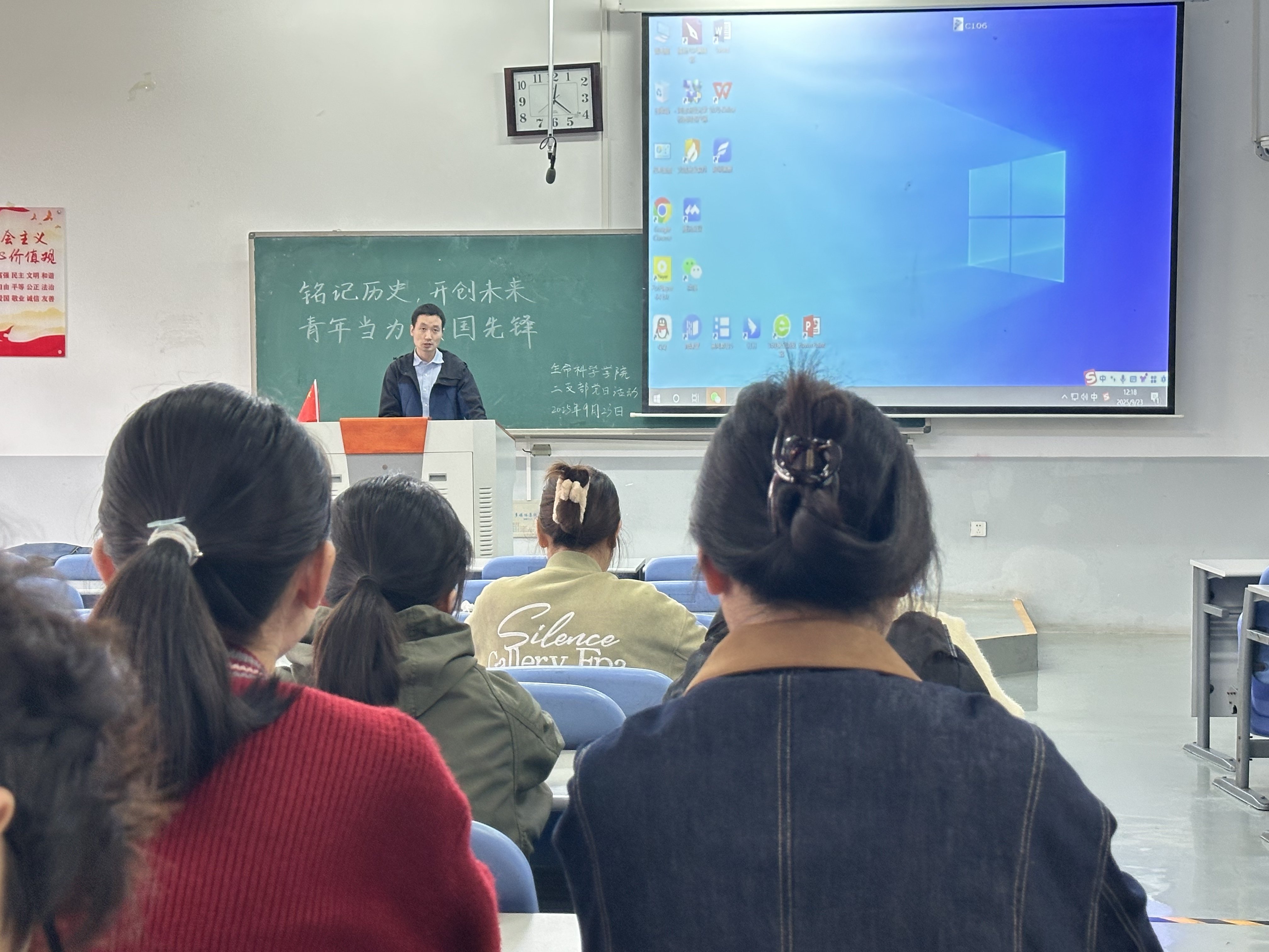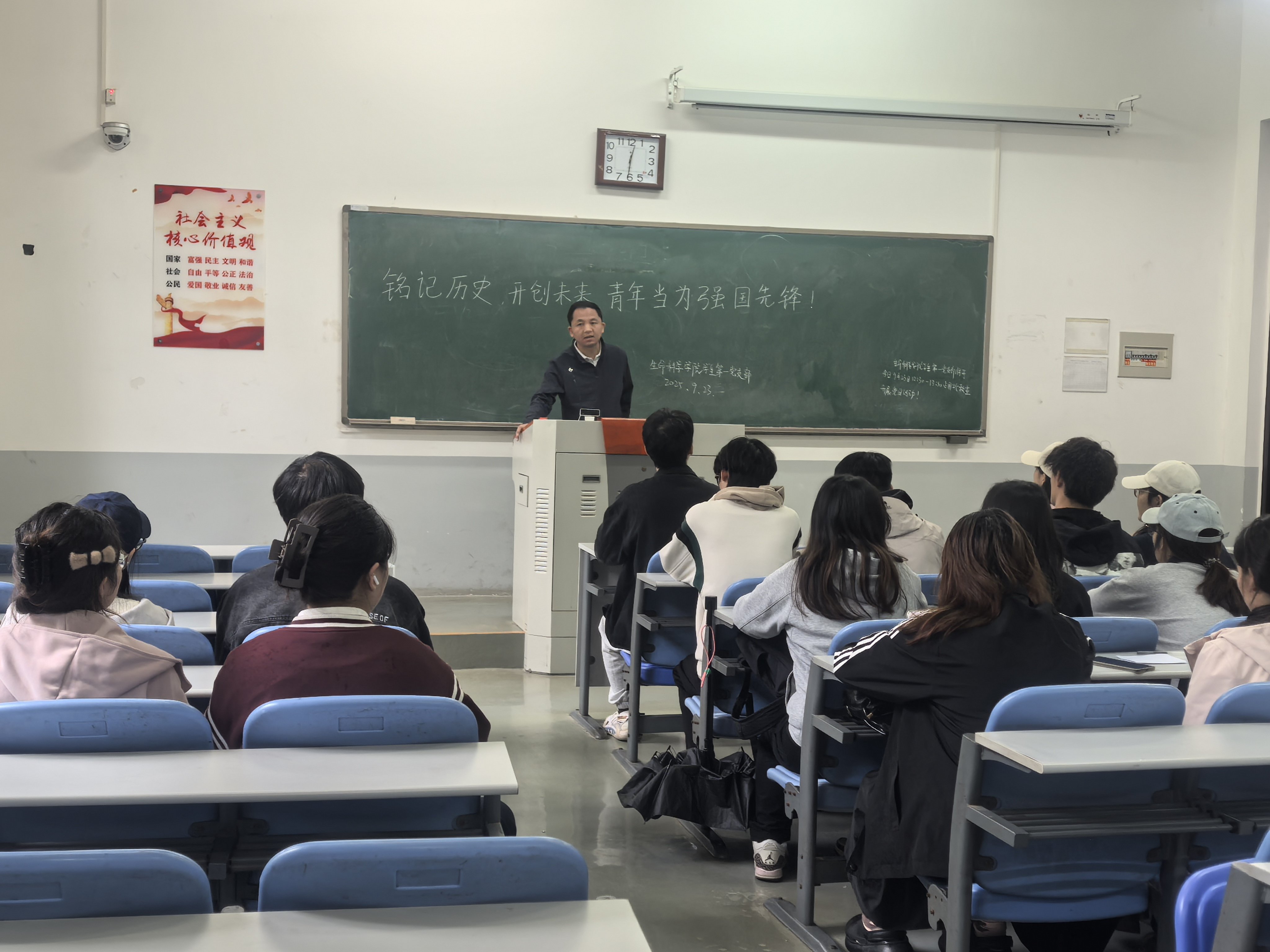 学生第一党支部以“历史启示与青年担当”为核心开展此次主题党日活动。22级、23级党员依次上台分享感悟,明晰“以史为鉴才能少走弯路”的认知,从中学会将个人成长与国家发展同频;随后支部书记刘展结合9月3日阅兵观礼经历,从国家实力提升、历史教训反思等史实出发,进一步让党员们懂得需立足身份对标合格标准,主动扛起先锋责任。