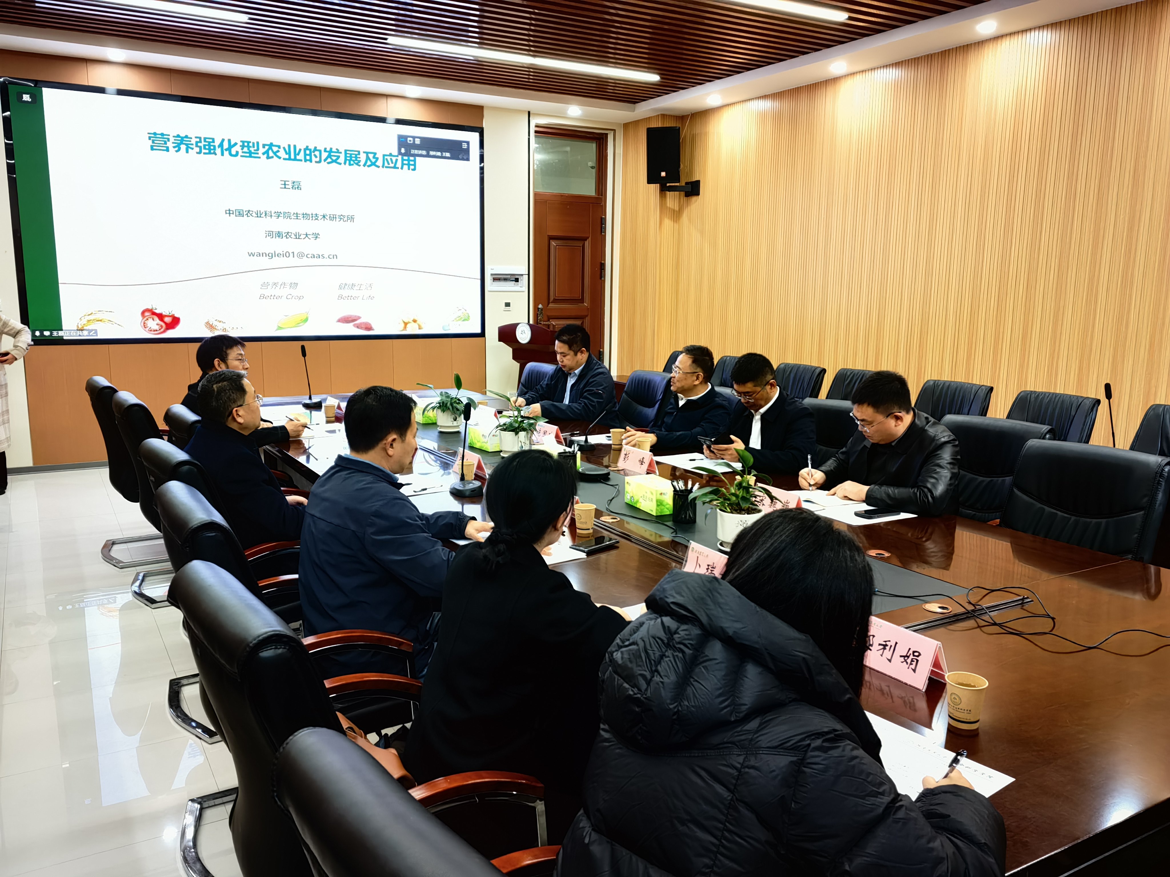 本网讯(通讯员 卜瑞方)11月24日上午,河南农业投资集团有限公司到我院访问,就科技创新与成果转化开展交流对接。河南农业投资集团有限公司副总经理、黄泛区实业集团党委书记、董事长施国政,黄泛区实业集团总经理彭峰,副总经理梁欢,黄泛区农业发展公司董事长宋巍巍参加会议,校兼职教授、中国农业科学院生物技术所王磊,院长张会勇,副院长赵华新、袁志良、赵月出席会议,学院教师代表参加会议。会议由张会勇主持。