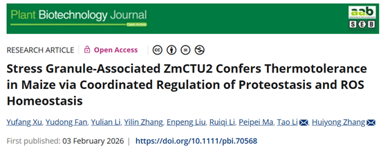 本网讯(通讯员 徐玉芳)近日,我院张会勇团队在Plant Biotechnology Journal (中科院一区,IF 10.5)在线发表了题为“Stress Granule-associated ZmCTU2 Confers Thermotolerance in Maize via Coordinated Regulation of Proteostasis and ROS Homeostasis”的研究论文。该研究发现tRNA硫醇化蛋白ZmCTU2作为应激颗粒支架蛋白协同调控蛋白质稳态与抗氧化通路,过表达ZmCTU2可显著增强玉米幼苗和成株期的耐热性,提高热胁迫下的存活率与田间产量,为玉米耐热遗传改良提供了重要基因资源。